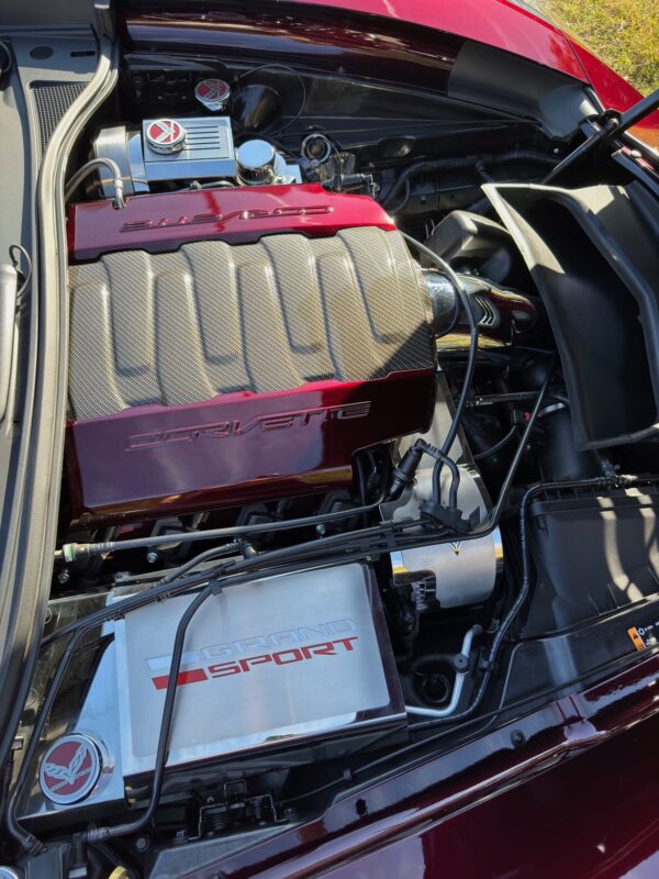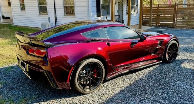 This 2019 Corvette Grand Sport 3LT was bought in May 2020 by the original owner, who lived in Southern California. He bought it from a Dealership in Fort Collins, CO. As you can see from the build sheet, the car was originally Arctic White with Grand Sport fender stripes and machine gray wheels. This is hearsay, but apparently the owner really liked the color Black Rose, but that color was only offered in 2017 and 2018. He bought the Corvette, drove it back to California and immediately had it repainted. As you can see, the color is NOT Black Rose. The color is Brandywine with Candy treatment using House of Kolor paint, which has since been confirmed. It is a high quality paint job!!!